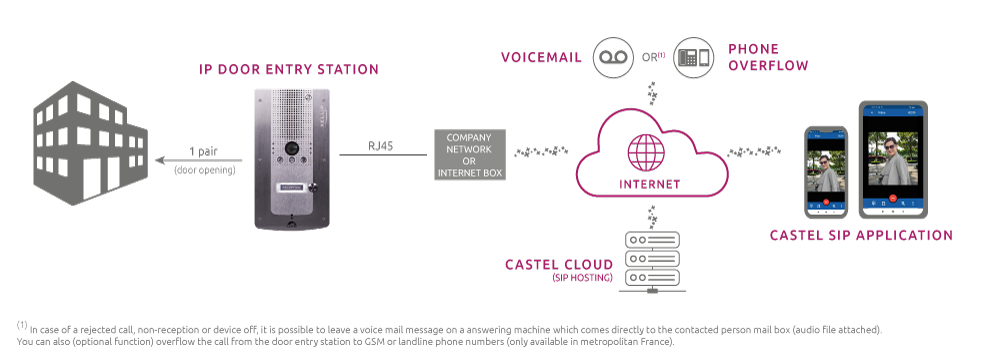 > Full IP/SIP door entry station pre-set by Castel, application, SIP hosting on our servers (Castel Cloud), 1 hour telephone assistance