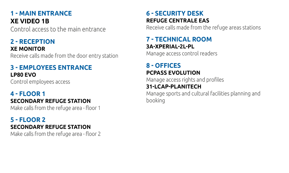 > Access control management for personnel, car parks and restricted areas, etc. (different companies can use the system thanks to access profiles)
