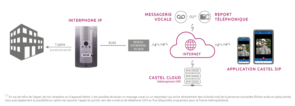 > un interphone Full IP/SIP pré-paramétré, l’application, l’hébergement sur notre serveur SIP (Castel Cloud), l’assistance téléphonique gratuite
