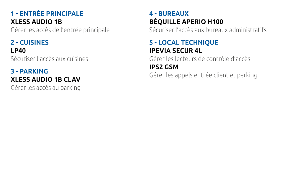 > Interphonie de sécurité (alarmes incendie, appels d’urgence), supervision graphique et gestion du contrôle d’accès (personnel, parkings, livraisons…)